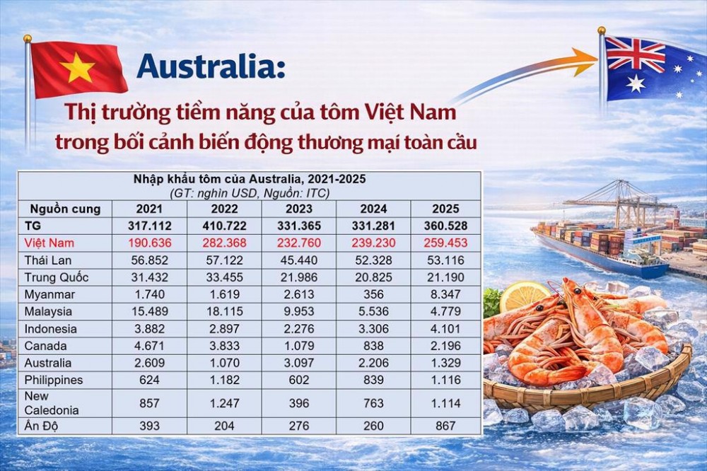 Theo số liệu thương mại quốc tế, Australia có nhu cầu nhập khẩu tôm khá lớn do nguồn cung trong nước hạn chế. Tổng kim ngạch nhập khẩu tôm của nước này dao động từ 317 triệu USD năm 2021 lên 360,5 triệu USD năm 2025, với sự biến động nhất định do chu kỳ tiêu dùng và tồn kho.