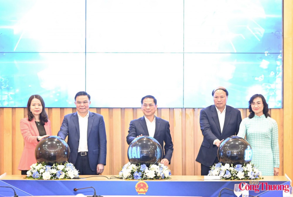 Phó Thủ tướng Chính phủ Bùi Thanh Sơn, Quyền Bộ trưởng Bộ Công Thương Lê Mạnh Hùng, Thứ trưởng Bộ Công Thương Phan Thị Thắng, Thứ trưởng Bộ Ngoại giao Nguyễn Minh Hằng và Phó Chủ tịch UBND tỉnh Cao Bằng Hoàng Văn Thạch thực hiện nghi thức khai trương Nền tảng số về phát triển thị trường nước ngoài.