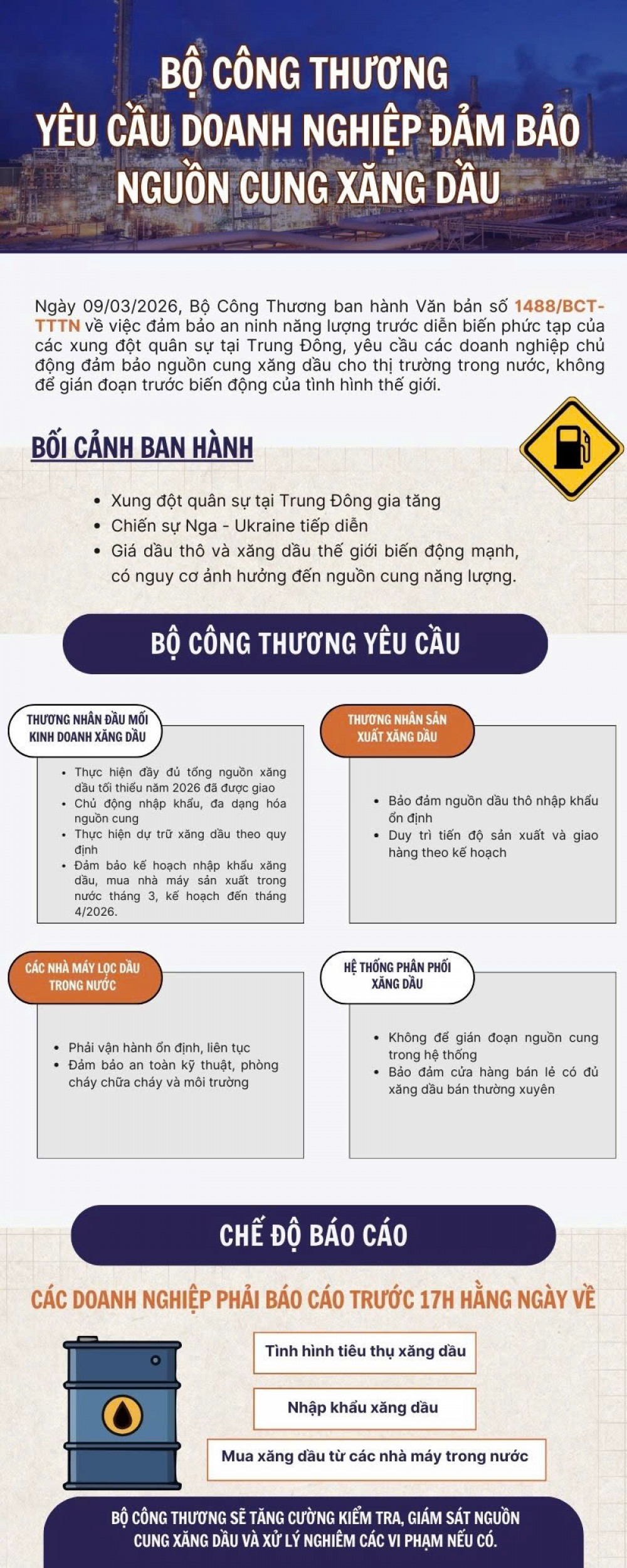 Ngày 9/3/2026, Bộ Công Thương đã ban hành Công văn số 1488/BCT-TTTN về việc bảo đảm an ninh năng lượng trước diễn biến phức tạp của cuộc xung đột quân sự tại Trung Đông.