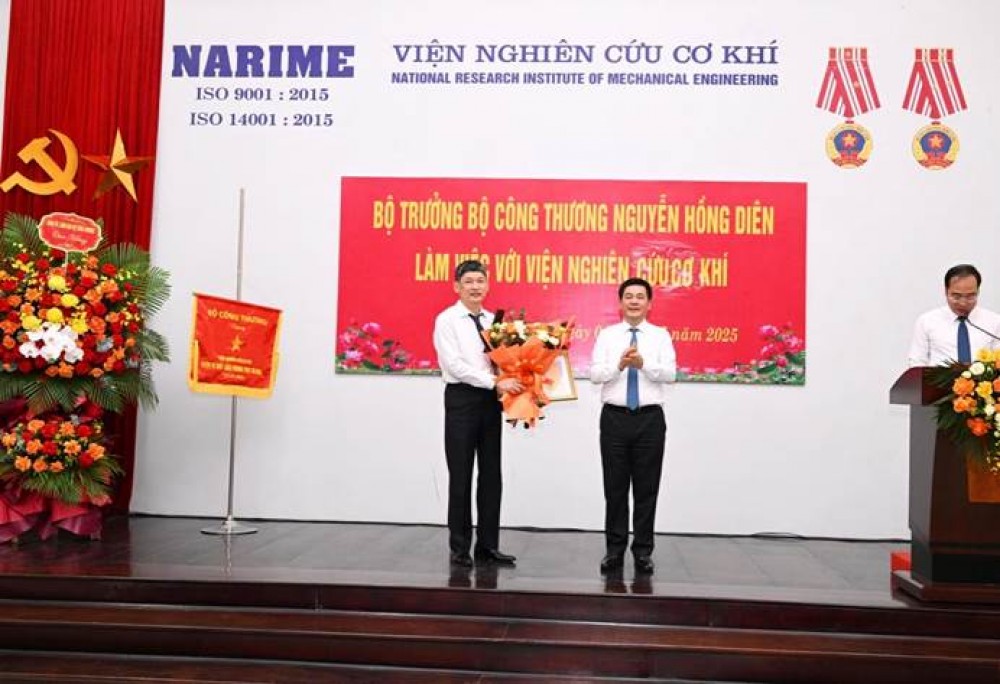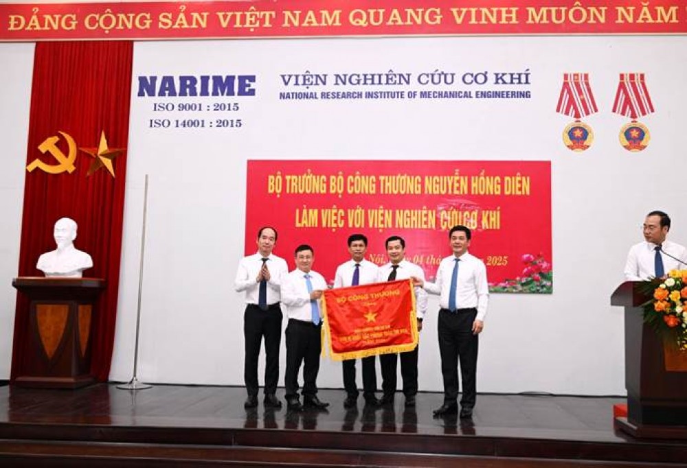 Nhân dịp này, Bộ trưởng Nguyễn Hồng Diên đã trao cờ thi đua của Bộ Công Thương cho Viện Nghiên cứu Cơ khí vì đã có thành tích tiêu biểu, xuất sắc trong các phong trào thi đua, góp phần vào sự nghiệp xây dựng và phát triển ngành Công Thương Việt Nam năm 2024.