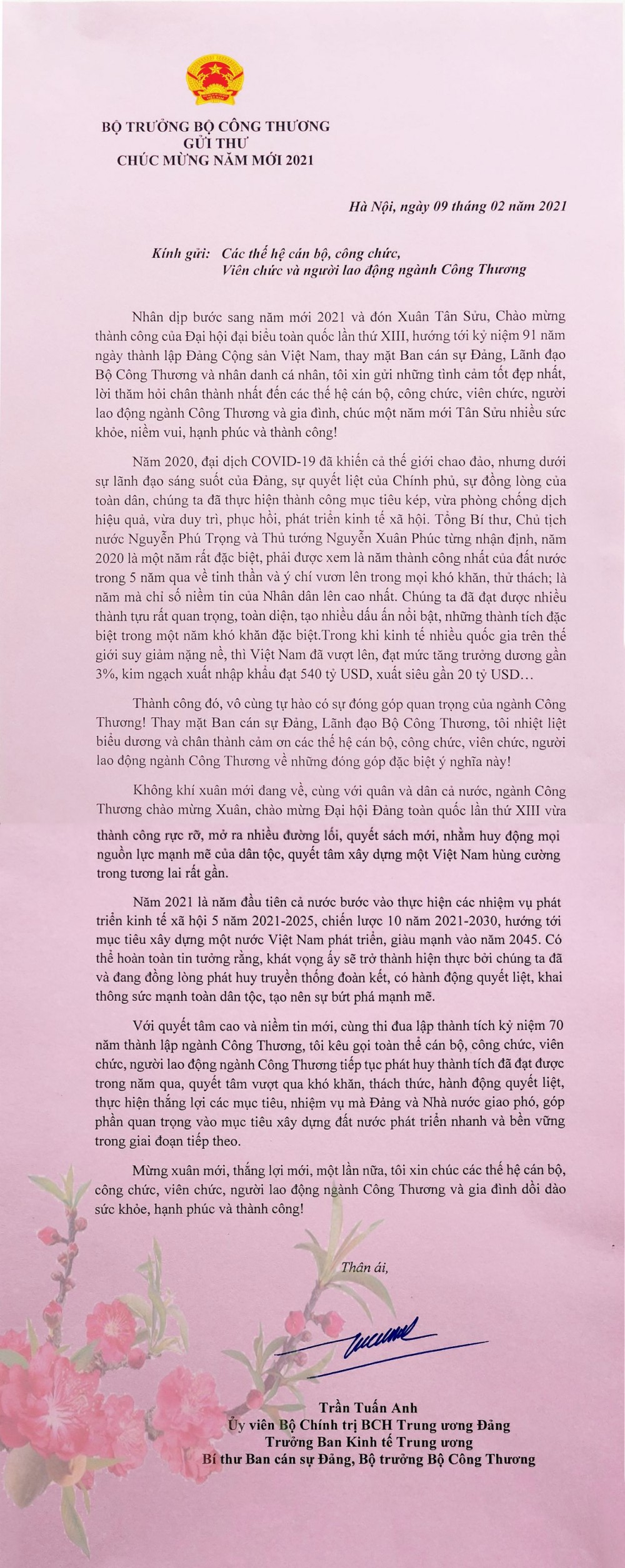 Nhân dịp bước sang năm mới 2021 và đón Xuân Tân Sửu, Chào mừng thành công của Đại hội đại biểu toàn quốc lần thứ XIII, hướng tới kỷ niệm 91 năm ngày thành lập Đảng Cộng sản Việt Nam, thay mặt Ban cán sự Đảng, Lãnh đạo Bộ Công Thương và nhân danh cá nhân, Bộ trưởng Trần Tuấn Anh đã gửi những tình cảm tốt đẹp nhất, lời thăm hỏi chân thành nhất đến các thế hệ cán bộ, công chức, viên chức, người lao động ngành Công Thương và gia đình, chúc một năm mới Tân Sửu nhiều sức khỏe, niềm vui, hạnh phúc và thành công!