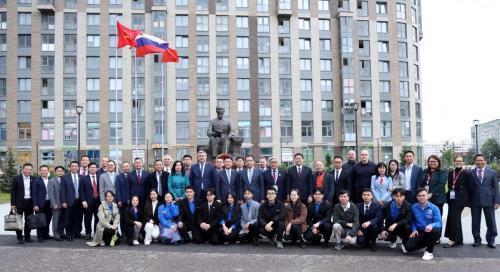 Phó Thủ tướng Chính phủ Lê Thành Long và đoàn đại biểu Việt Nam đặt hoa tưởng niệm tại tượng đài Chủ tịch Hồ Chí Minh tại Saint Peterburg