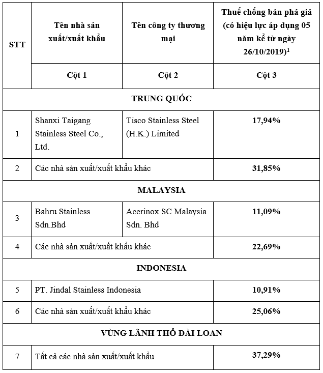 (VTIC-DNTM) Tin từ Cục Phòng vệ thương mại cho biết, ngày 21 tháng 10 năm 2019, Bộ Công Thương ban hành Quyết định số 3162/QĐ-BCT về kết quả rà soát cuối kỳ việc áp dụng biện pháp chống bán phá giá (CBPG) đối với một số sản phẩm thép không gỉ cán nguội có xuất xứ từ Trung Quốc, Indonesia, Malaysia và vùng lãnh thổ Đài Loan.