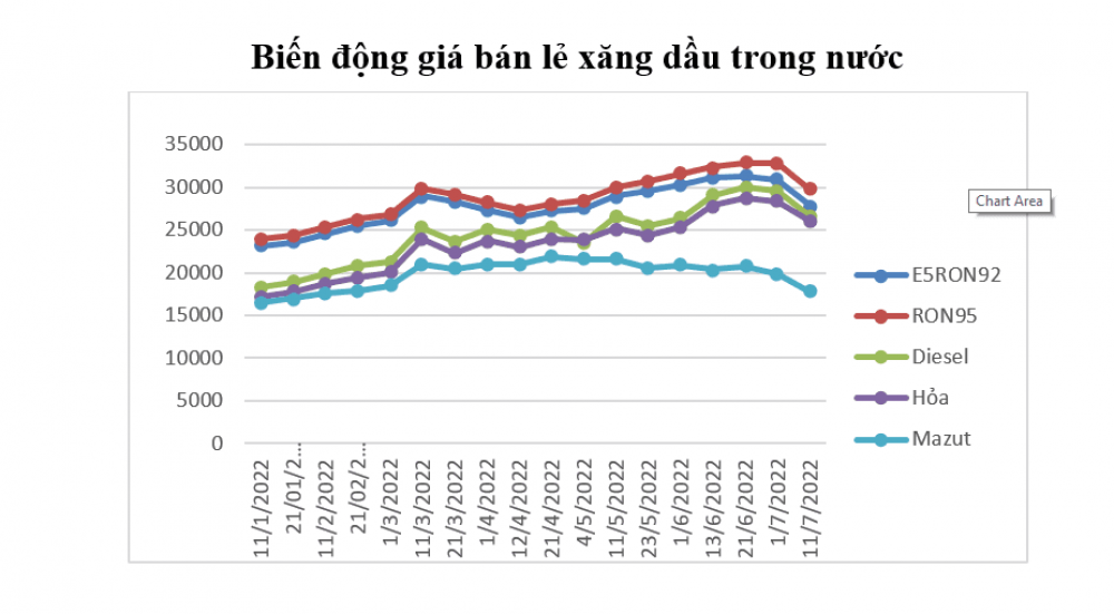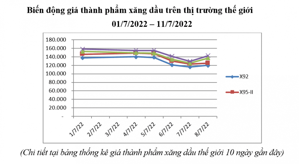 Thị trường xăng dầu thế giới giữa 02 kỳ điều hành vừa qua chịu tác động của các yếu tố kinh tế, chính trị. Giá xăng dầu diễn biến tăng giảm đan xen nhưng xu hướng chung là giảm. Việc giá xăng dầu diễn biến tăng giảm đan xen như trên do lo ngại về nguồn cung tiếp tục gặp trở ngại vì các lệnh cấm vận. Tuy nhiên, việc ổn định sản xuất của OPEC+ và việc Mỹ thắt chặt các lệnh trừng phạt đối với Iran khiến giá xăng dầu có xu hướng tăng. Bên cạnh đó, những dự báo và lo ngại về suy giảm kinh tế toàn cầu cùng với việc biến chủng mới của dịch bệnh Covid-19 có dấu hiệu diễn biến phức tạp tại một số quốc gia đã tác động đến nhu cầu xăng dầu nên giá xăng dầu đã có xu hướng giảm. Bình quân giá thành phẩm xăng dầu thế giới giữa 02 kỳ điều hành giá ngày 01/7/2022 và ngày 11/7/2022 là: 128,707 USD/thùng xăng RON92 dùng để pha chế xăng E5RON92 (giảm 19,070 USD/thùng, tương đương giảm 12,90% so với kỳ trước); 136,530 USD/thùng xăng RON95 (giảm 18,314 USD/thùng, tương đương giảm 11,83% so với kỳ trước; 140,858 USD/thùng dầu hỏa (giảm 21,062 USD/thùng, tương đương giảm 13,00% so với kỳ trước); 146,705 USD/thùng dầu điêzen (giảm 20,690 USD/thùng, tương đương giảm 12,36% so với kỳ trước); 533,750 USD/tấn dầu mazut 180CST 3,5S (giảm 72,645 USD/tấn, tương đương giảm 11,980% so với kỳ trước).