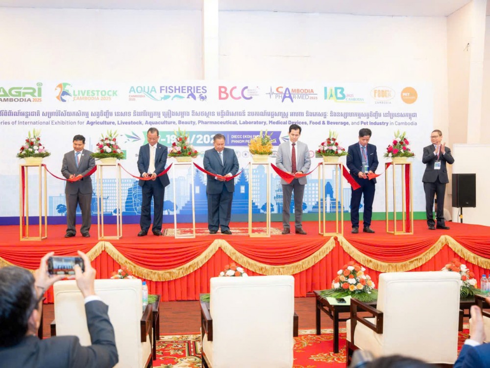 Các đại biểu cắt băng khai mạc Hội chợ Nông nghiệp, Chăn nuôi, Thủy sản, Thực phẩm, Đồ uống Campuchia 2025