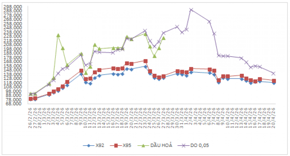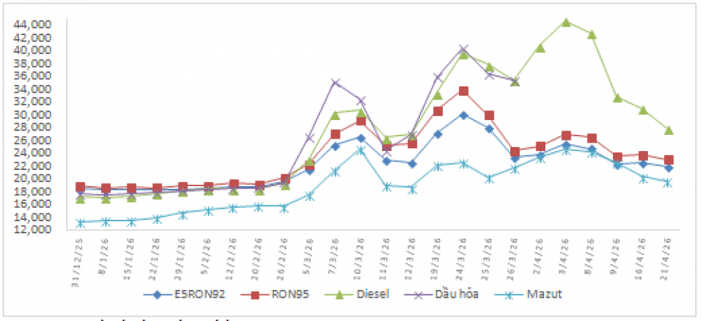 Biến động giá bán xăng dầu trong nước năm 2026 (31/12/2025 đến 21/4/2026)