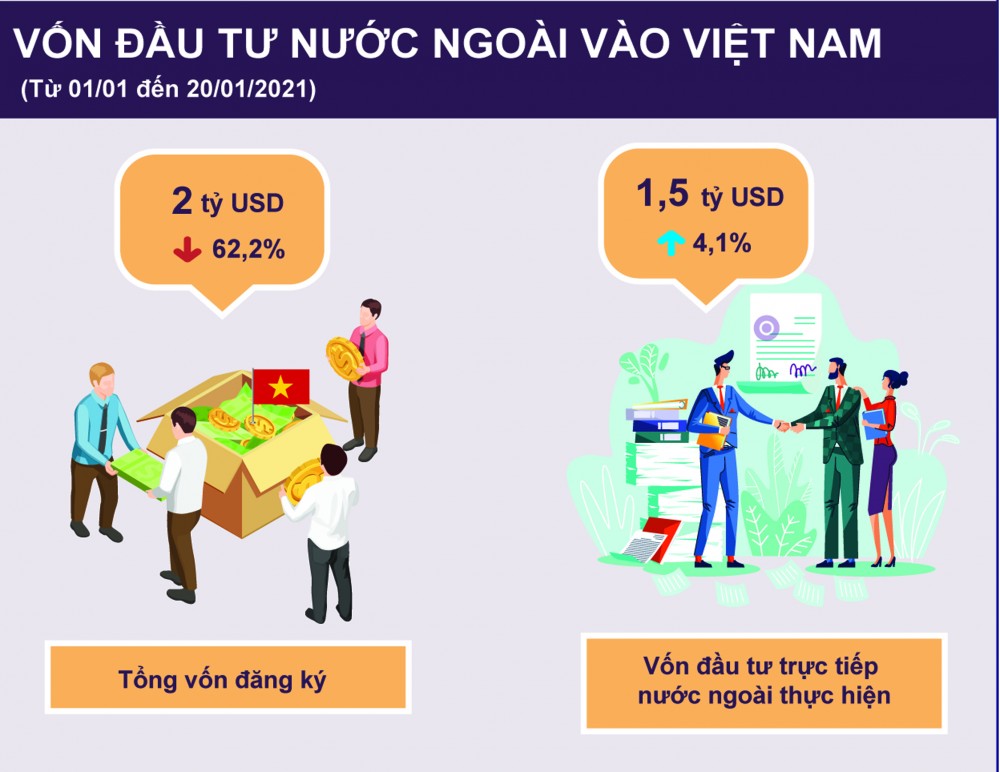 Tin từ Tổng cục Thống kê, tổng vốn đầu tư nước ngoài vào Việt Nam tính đến ngày 20/01/2021 bao gồm vốn đăng ký cấp mới, vốn đăng ký điều chỉnh và giá trị góp vốn, mua cổ phần của nhà đầu tư nước ngoài đạt hơn 2 tỷ USD, giảm 62,2% so với cùng kỳ năm 2020.