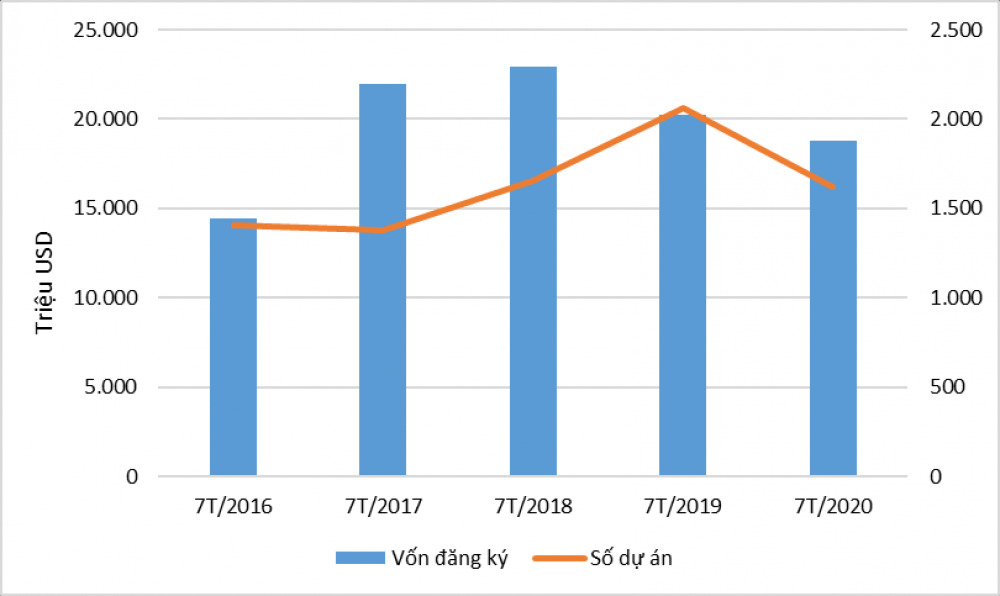 Trong 7 tháng năm 2020, ngành công nghiệp chế biến, chế tạo được cấp phép mới đầu tư trực tiếp nước ngoài lớn nhất với số vốn đăng ký đạt 4,3 tỷ USD, chiếm 45,7% tổng số vốn đăng ký cấp mới; ngành sản xuất, phân phối điện, khí đốt, nước nóng, hơi nước và điều hòa không khí đạt 4 tỷ USD, chiếm 42,3%; các ngành còn lại đạt 1,2 tỷ USD, chiếm 12%. Nếu tính cả vốn đăng ký bổ sung của các dự án đã cấp phép từ các năm trước thì vốn đầu tư trực tiếp nước ngoài vào ngành công nghiệp chế biến, chế tạo đạt 7,7 tỷ USD, chiếm 54,4% tổng số vốn; ngành sản xuất, phân phối điện, khí đốt, nước nóng, hơi nước và điều hòa không khí đạt 3,9 tỷ USD[8], chiếm 27,2%; các ngành còn lại đạt 2,6 tỷ USD, chiếm 18,4%. Đối với hình thức góp vốn, mua cổ phần của nhà đầu tư nước ngoài, vốn đầu tư vào ngành công nghiệp chế biến, chế tạo đạt hơn 1,2 tỷ USD, chiếm 26,9% tổng vốn; hoạt động kinh doanh bất động sản đạt gần 1,2 tỷ USD, chiếm 25,8%; các ngành còn lại đạt 2,2 tỷ USD, chiếm 47,3%.