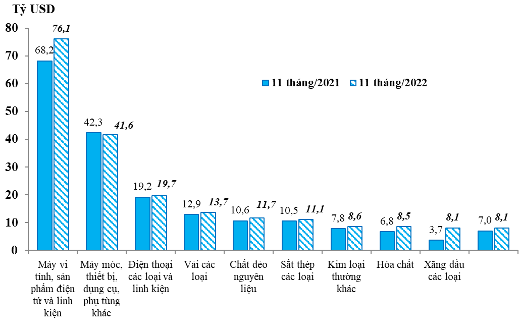 Tính trong 11 tháng/2022, tổng trị giá xuất nhập khẩu hàng hoá của Việt Nam đạt 673,7 tỷ USD, tăng 11,8% (tương ứng tăng 70,92 tỷ USD) so với cùng kỳ năm 2021. Trong đó, trị giá xuất khẩu là gần 342,2 tỷ USD, tăng 13,4%, tương ứng tăng 40,5 tỷ USD so với cùng kỳ năm trước; trị giá nhập khẩu là 331,5 tỷ USD, tăng 10,1%, tương ứng tăng 30,42 tỷ USD.