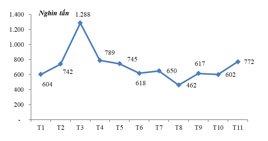 Xăng dầu các loại: lượng nhập khẩu trong tháng 11 là là 772 nghìn tấn, tăng mạnh 28,3% so với tháng trước.