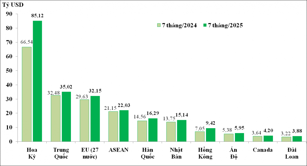 - Hoa Kỳ: trị giá xuất khẩu sang thị trường Hoa Kỳ trong 7 tháng/2025 đạt 85,12 tỷ USD, tăng tới 27,9%, tương ứng tăng 18,58 tỷ USD so với cùng kỳ năm trước và chiếm tới 32% trong tổng trị giá xuất khẩu của cả nước.