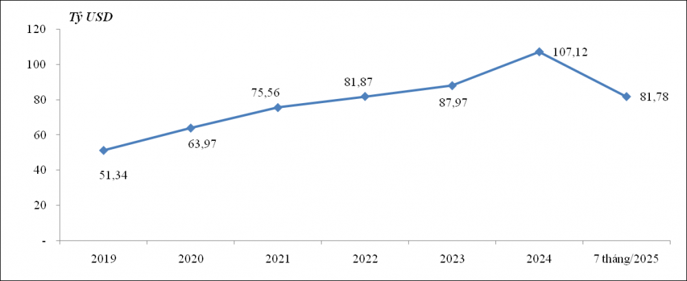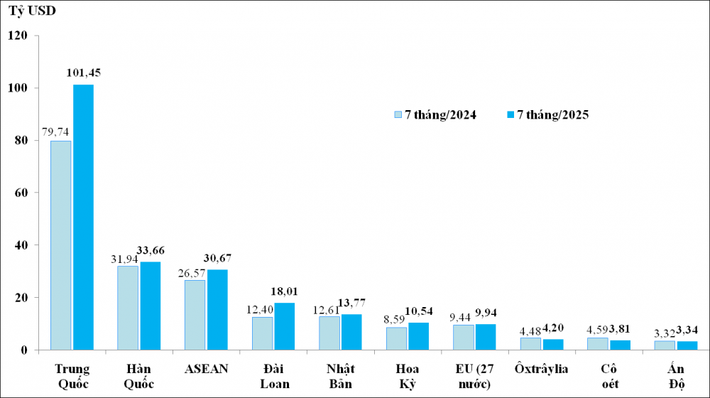 - Trung Quốc: trong 7 tháng/2025, tổng trị giá nhập khẩu từ thị trường Trung Quốc đạt 101,45 tỷ USD, tăng 27,2%, tương ứng tăng 21,71 tỷ USD so với cùng kỳ năm trước và chiếm tới 40,2% trong tổng trị giá nhập khẩu của cả nước.