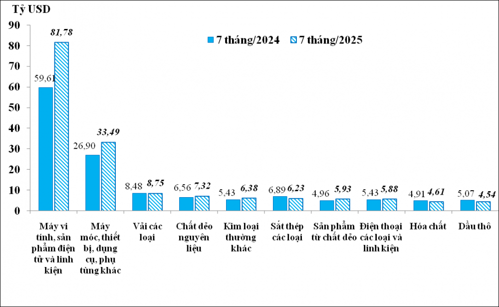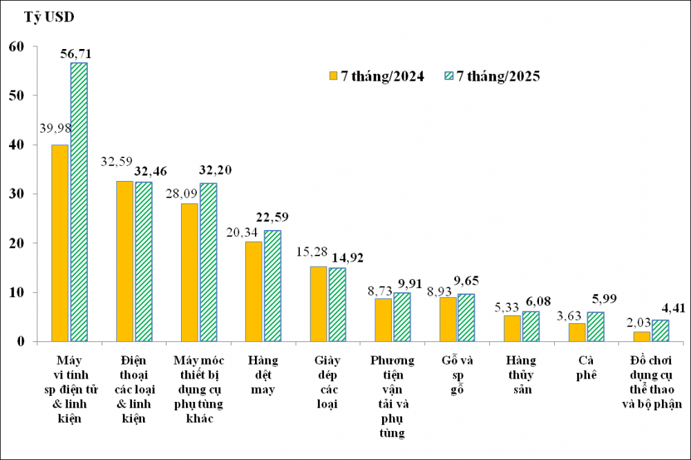 - Máy vi tính, sản phẩm điện tử và linh kiện: trị giá xuất khẩu nhóm hàng này trong tháng 7/2025 đạt 9 tỷ USD, qua đó nâng mức trị giá xuất khẩu trong 7 tháng/2025 đạt 56,71 tỷ USD, chiếm tới 22% tổng trị giá xuất khẩu của cả nước và tăng 41,9% (tương ứng tăng 16,73 tỷ USD) so với cùng kỳ năm trước.