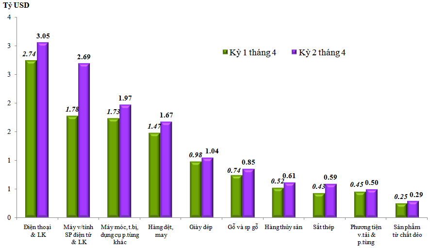 Trị giá xuất khẩu kỳ 2 tháng 4/2022 biến động tăng so với kỳ 1 tháng 4/2022 ở một số nhóm hàng sau: máy vi tính, sản phẩm điện tử và linh kiện tăng 914 triệu USD, tương ứng tăng 51,5%; điện thoại các loại & linh kiện tăng 312 triệu USD, tương ứng tăng 11,4%; máy móc, thiết bị, dụng cụ và phụ tùng khác tăng 239 triệu USD, tương ứng tăng 13,8%; hàng dệt may tăng 201 triệu USD, tương ứng tăng 13,6%...