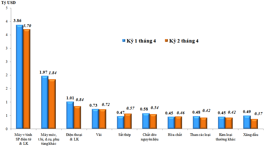 Trị giá nhập khẩu hàng hóa trong kỳ 2 tháng 4/2022 giảm so với kỳ 1 trước đó chủ yếu ở một số nhóm hàng sau: dầu thô giảm 234 triệu USD, tương ứng giảm 39,5%; điện thoại các loại & linh kiện giảm 175 triệu USD, tương ứng giảm 17,3%; máy vi tính, sản phẩm điện tử & linh kiện giảm 160 triệu USD, tương ứng giảm 4,2%; máy móc, thiết bị, dụng cụ & phụ tùng khác giảm 129 triệu USD, tương ứng giảm 6,5%...