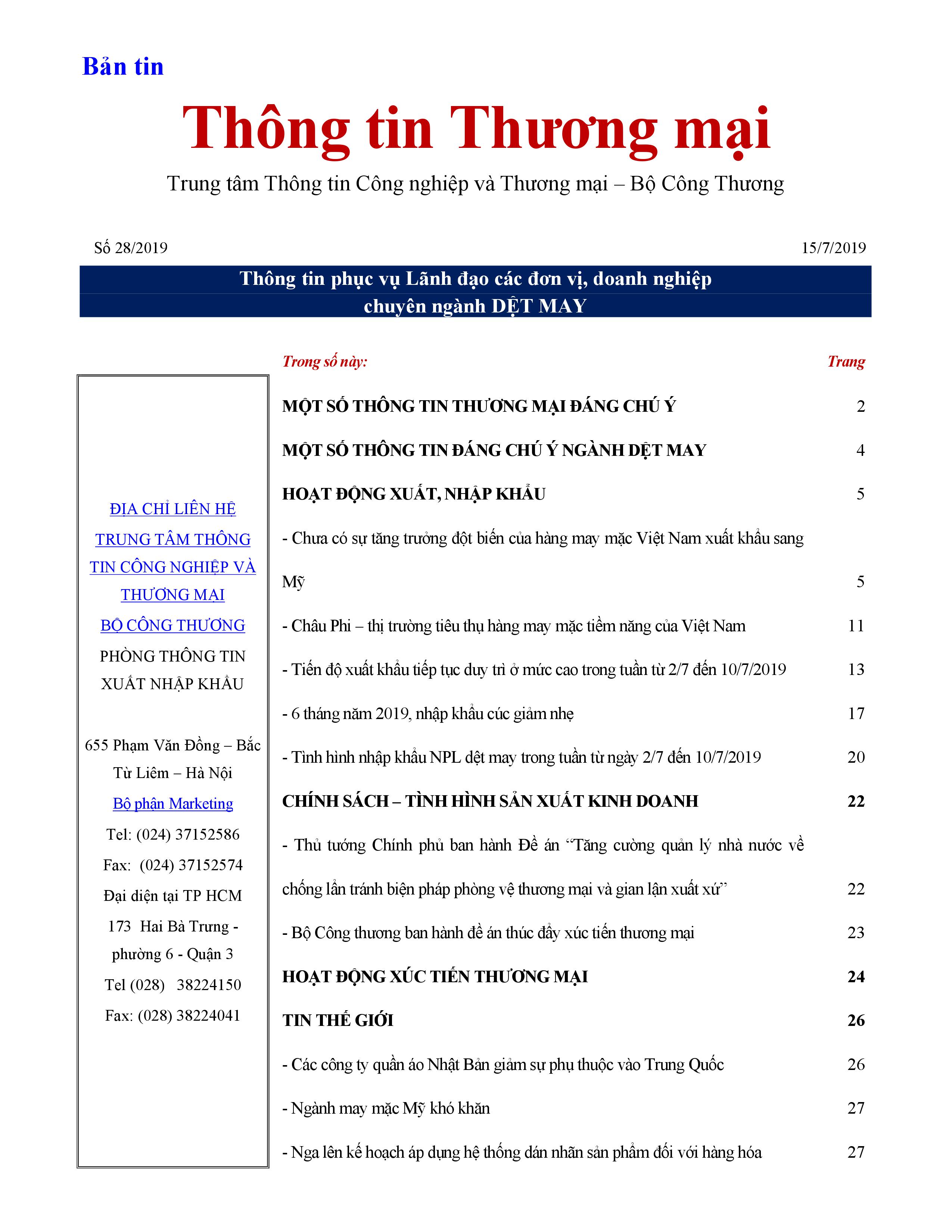 Trung tâm TTCN và TM giới thiệu Bản tin chuyên ngành Dệt may Số 28/2019