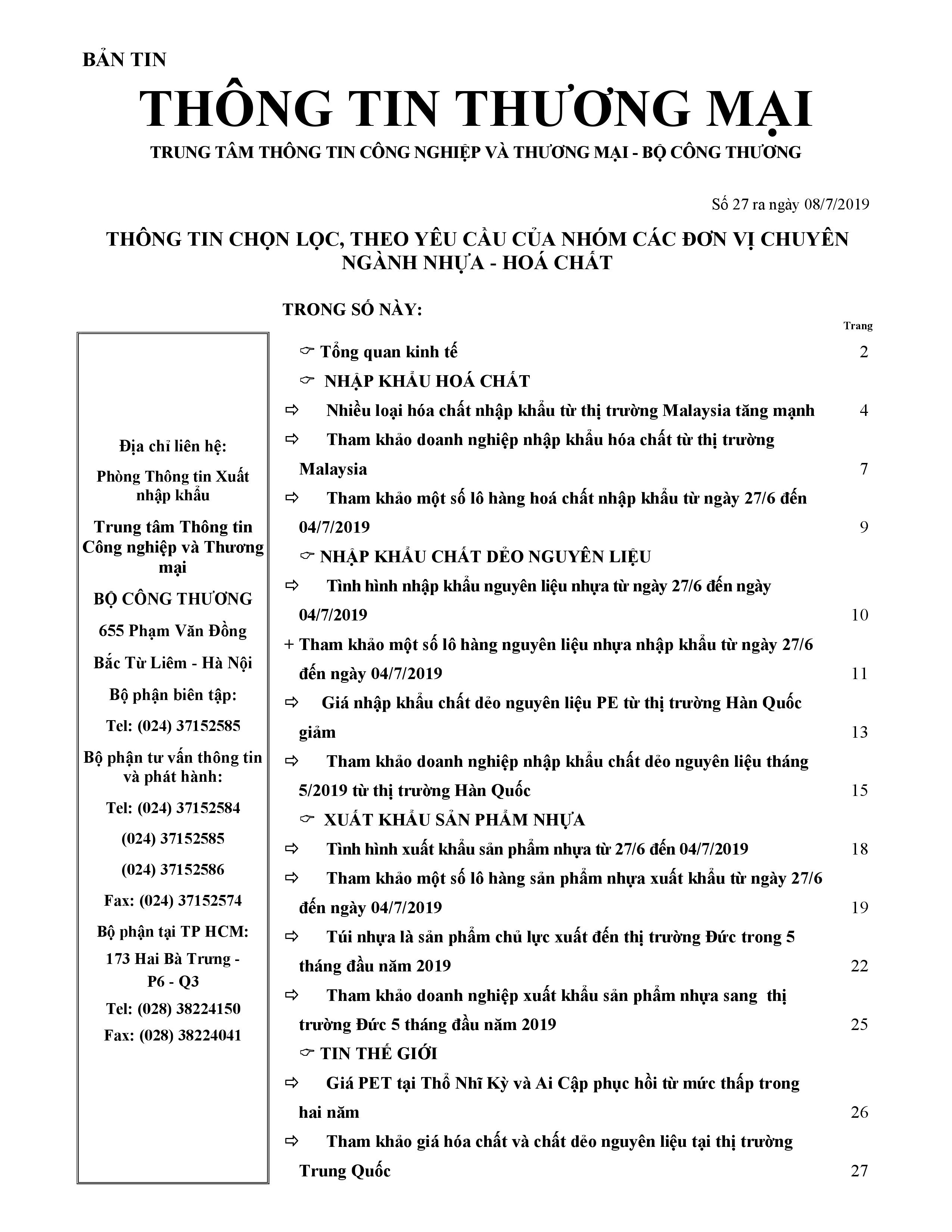 Trung tâm TTCN và TM giới thiệu Bản tin chuyên ngành Nhựa - Hóa chất Số 27/2019