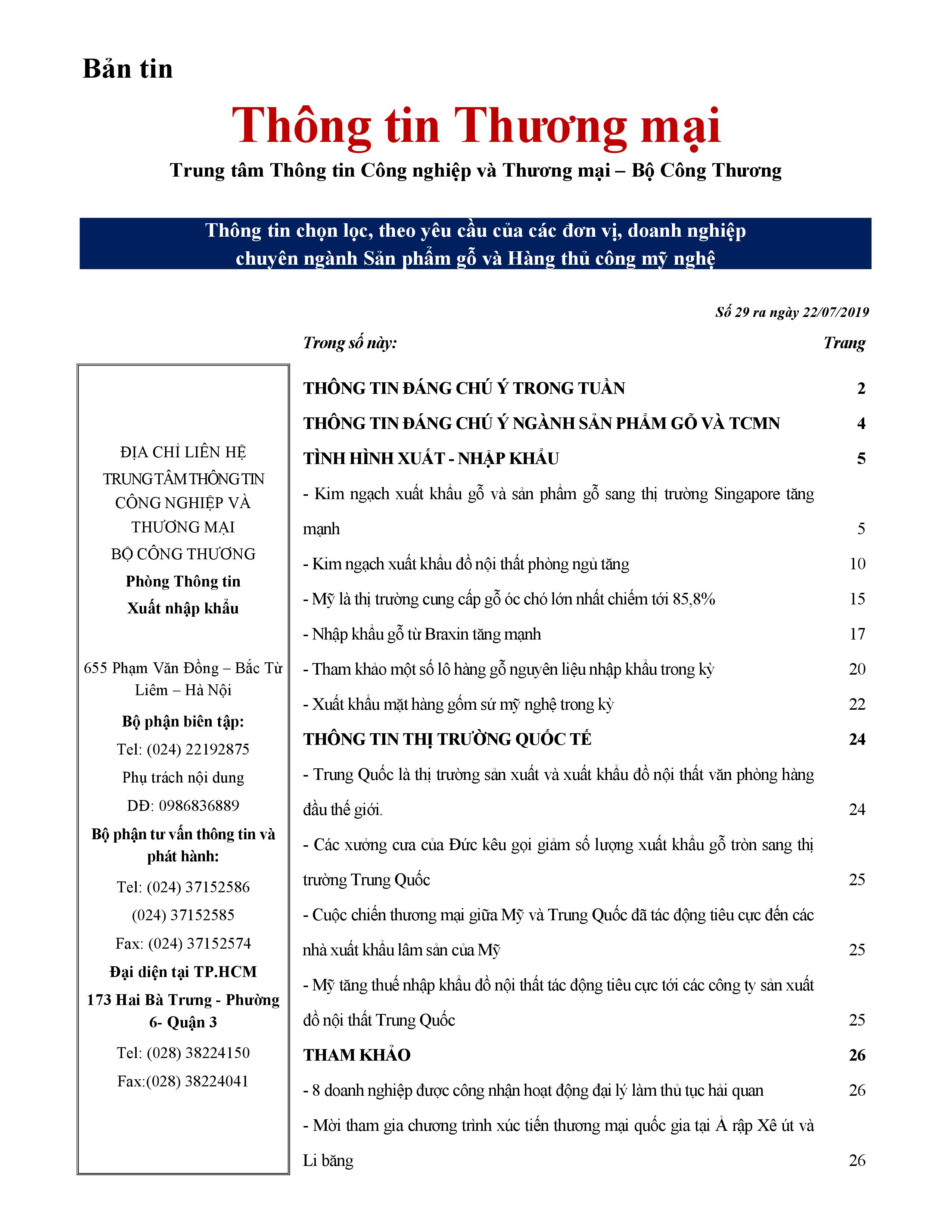 Trung tâm TTCN và TM giới thiệu Bản tin chuyên ngành sản phẩm Gỗ và hàng Thủ công Mỹ nghệ Số 29/2019