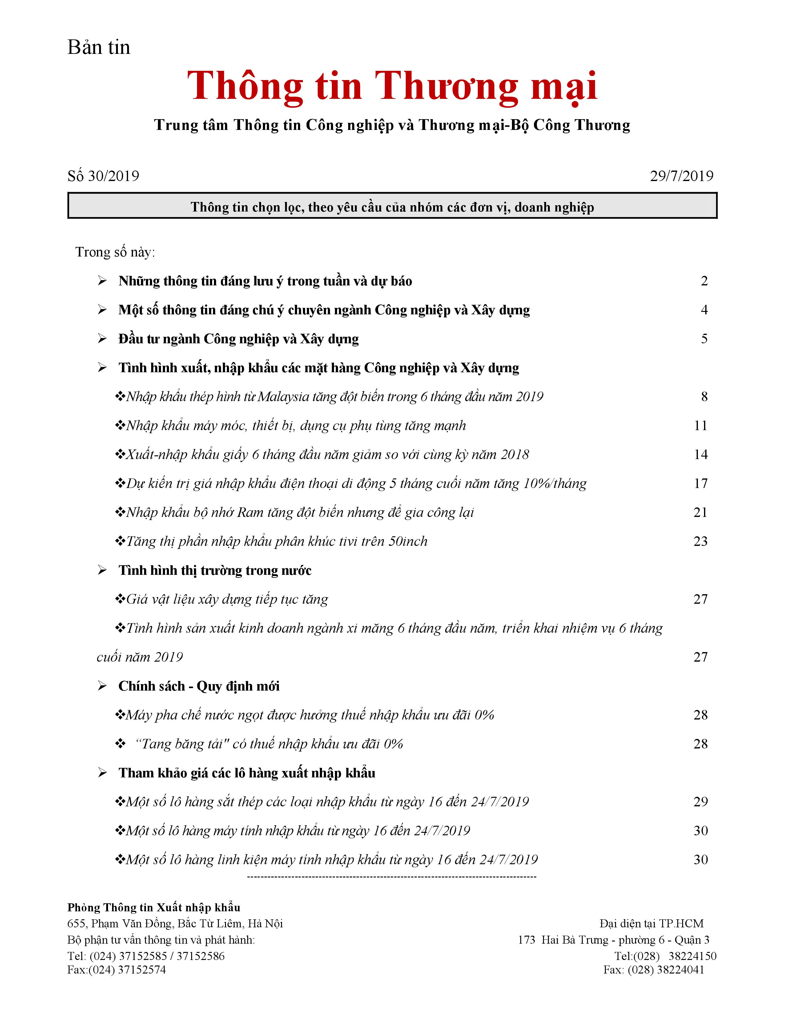 Những thông tin đáng lưu ý trong bản tin: Thị trường hàng hóa nguyên liệu thế giới tháng 7 năm 2019; Biểu đồ diễn biến giá một số loại hàng hóa thế giới tháng 7/2019; Thị trường hàng hóa nguyên liệu trong nước tháng 7/2019; Các chính sách mới có hiệu lực từ tháng 8/2019; Tham khảo giá NK thép tấm, thép cuộn, thép hình thị trường Nhật Bản ...