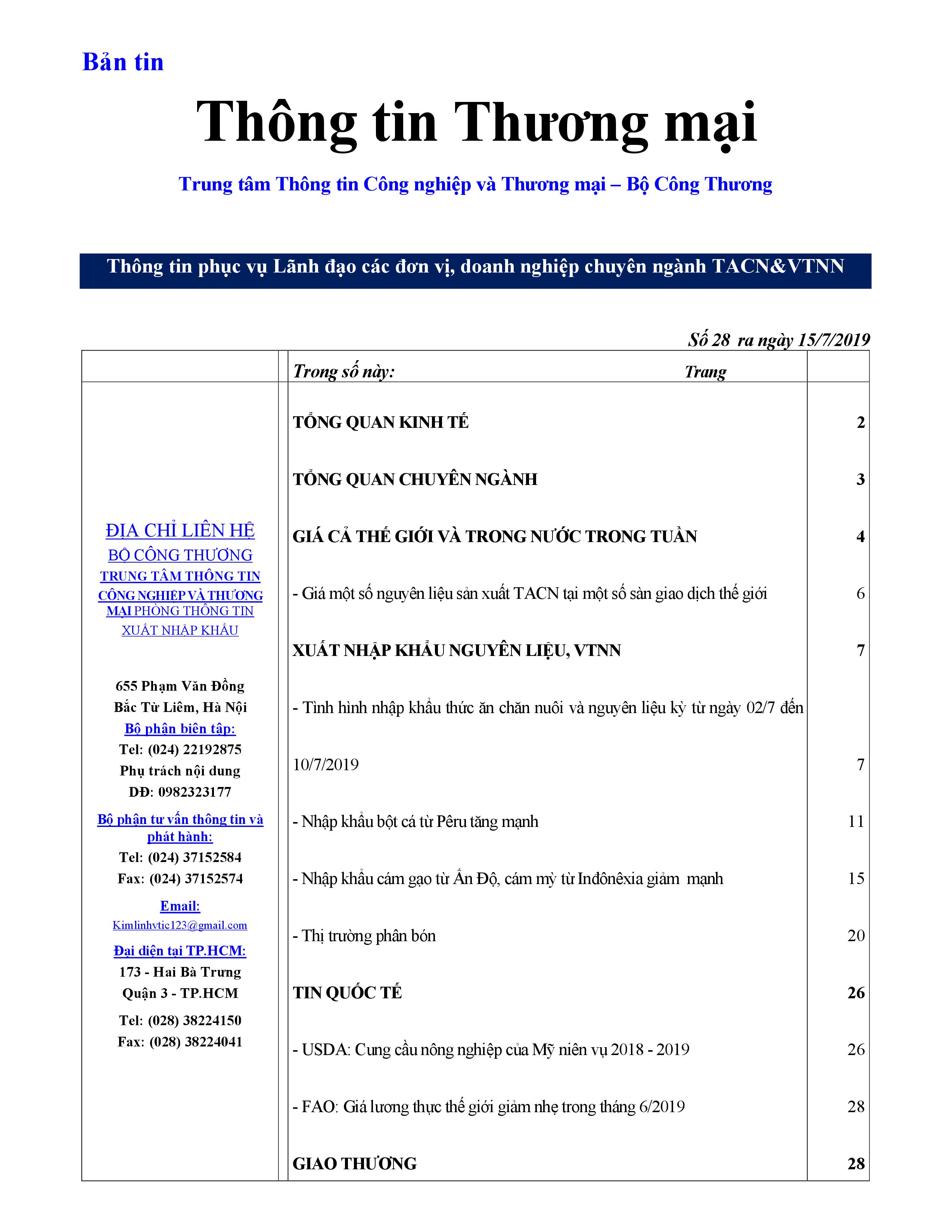 Trung tâm TTCN và TM phát hành Bản tin chuyên ngành Thức ăn chăn nuôi và Vật tư Nông nghiệp Số 28/2019