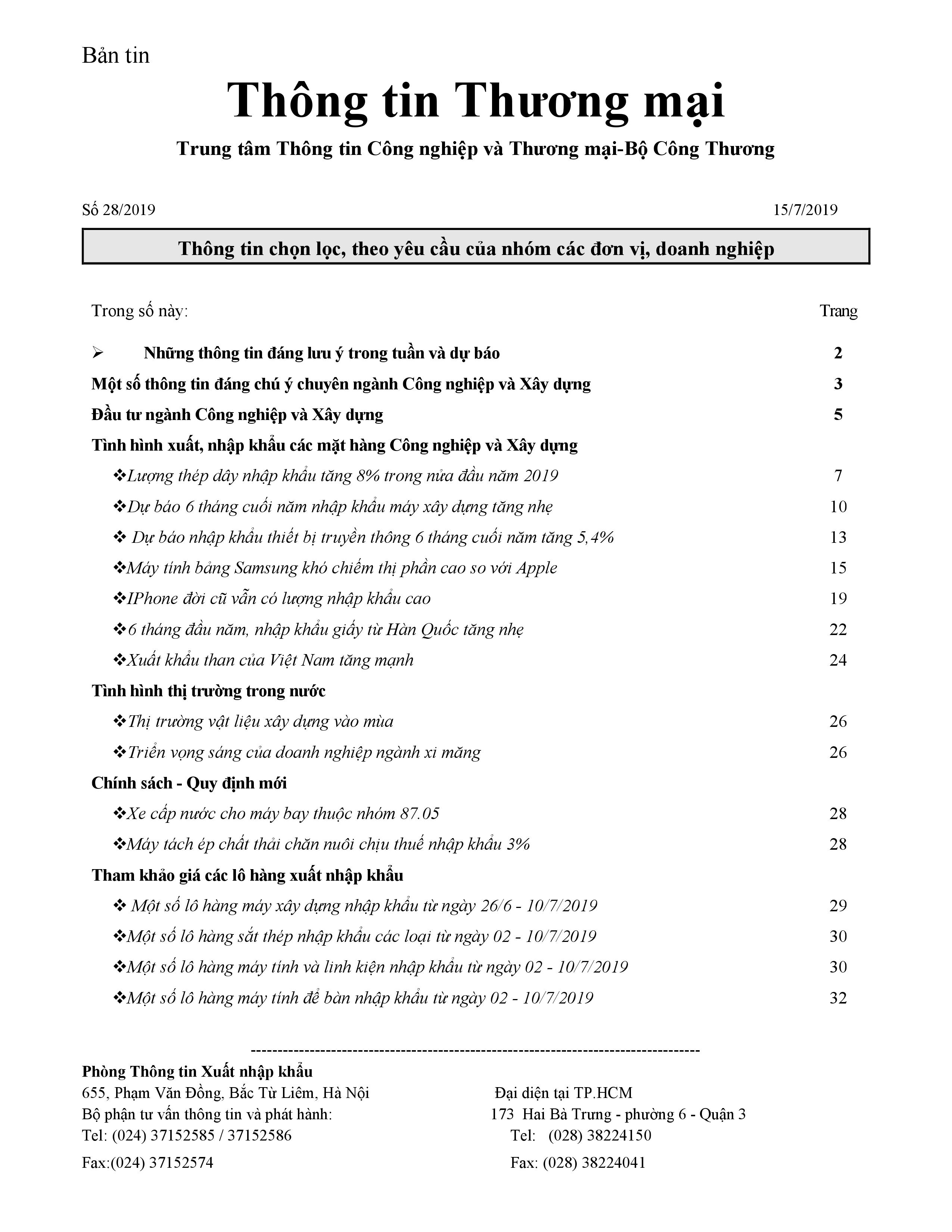 Bản tin có một số tin đáng lưu ý: Thặng dư thương mại của Việt Nam vẫn dựa vào doang nghiệp FDI; Hàng loạt xe ô tô được giảm giá tính phí trước bạ, xe xuống giá; Số liệu các mặt hàng XNK chủ yếu với Hàn Quốc tháng 6/2019; Tham khảo giá NK thép không hợp kim, thép lá, thép không gỉ thị trường Hàn Quốc ...