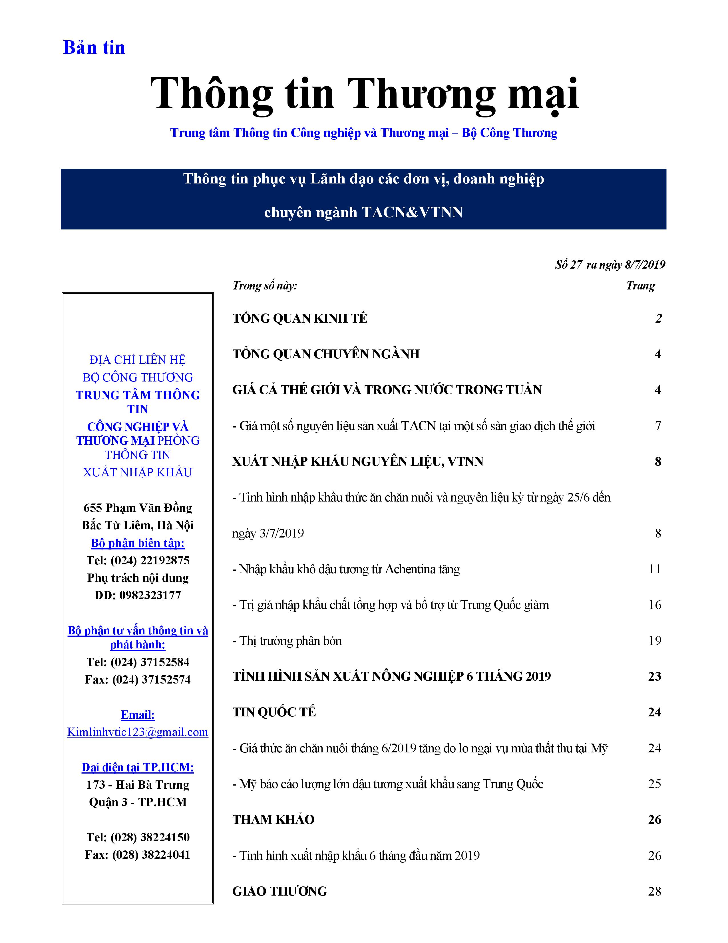 Một số thông tin đáng lưu ý trong bản tin: Tin Quốc tế và trong nước; Thông tin chính sách; Một số hoạt động phục vụ thuận lợi hóa thương mại; Hoạt đông thuận lợi hóa thương mại tại một số địa phương; Tác động của Hiệp định thương mại tự do Việt Nam - EU (EVFTA) đến xuất nhập khẩu nông sản của Việt Nam; Thống kê các biện pháp tạo thuận lị thương mại toàn cầu G20 giai đoạn T10/2018 - T5/2019 ...