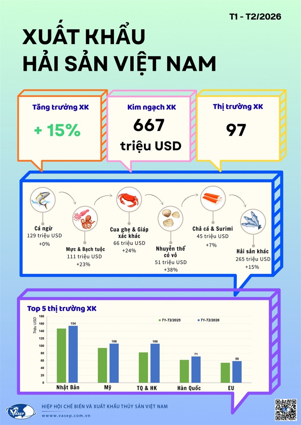 2 tháng đầu năm 2026, xuất khẩu hải sản Việt Nam đạt 667 triệu USD, tăng 15% và đã hiện diện tại 97 thị trường. Nhóm tăng nổi bật là nhuyễn thể có vỏ +38%, cua ghẹ & giáp xác +24%, mực & bạch tuộc +23%.